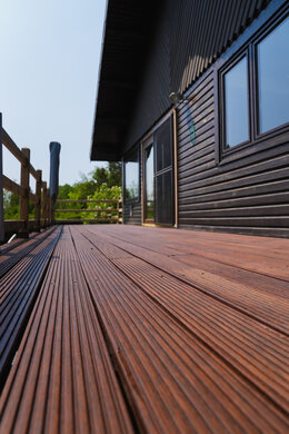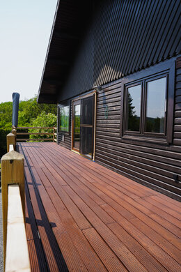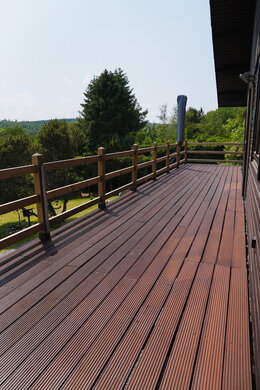 Cette terrasse en bois a reçu un ton profond et chaud grâce à DuroGrit « Steppe Look ». Il offre une protection extrêmement résistante pour les surfaces extérieures en bois tout en conservant l'aspect naturel du bois. Parfait pour les forêts et les terrains vallonnés des Ardennes !