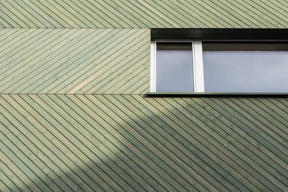 Ce revêtement en bois à chevrons est une touche de couleur bienvenue à côté de toutes les briques !