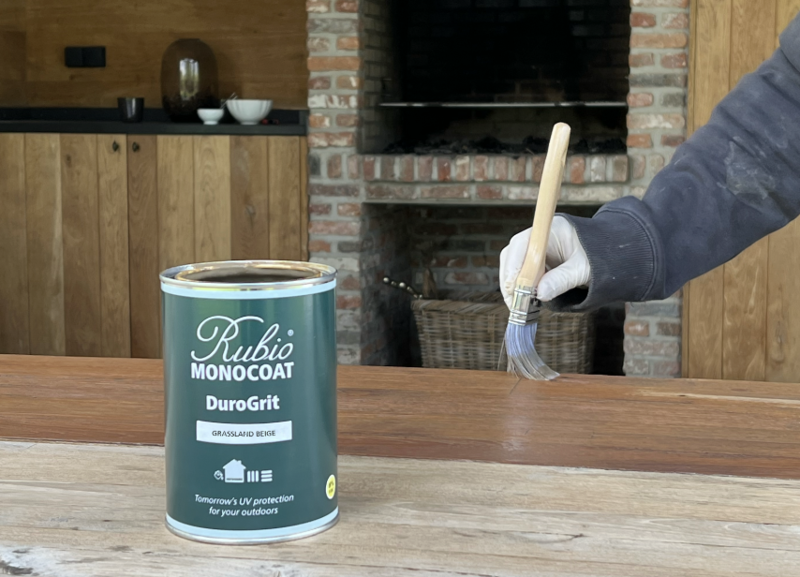 - Breng DuroGrit aan. Werk uitsluitend in vorstvrije en droge omstandigheden en breng DuroGrit niet aan als er binnen 10 uur na het aanbrengen regen wordt verwacht. Meng het product een paar minuten voor het gebruik ervan. Breng het product gelijkmatig aan op het oppervlak met een zachte, synthetische borstel voor watergedragen producten. Werk in de richting van het hout, altijd over de volledige lengte. Voor verticaal geplaatste planken is dit van boven naar beneden en voor horizontaal geplaatst hout van links naar rechts (of andersom). Stop dus nooit in het midden van een plank, maar alleen op een natuurlijke scheiding (bijv. een naad, rand, trap, enz.). Werk in kleine secties van 1 of 2 planken breed. Breng altijd voldoende product aan en ga er opnieuw over met de borstel om start- en stopsporen en borstelstrepen te voorkomen (oefen niet te veel druk uit op de borstel).