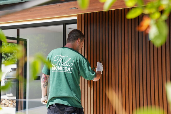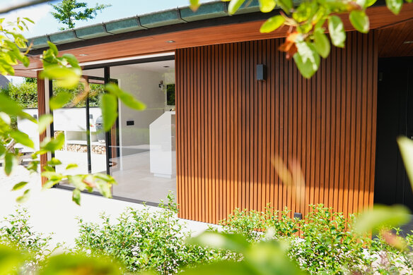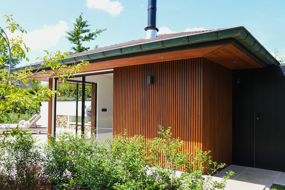 Dit poolhouse in thermo ayous werd afgewerkt met DuroGrit voor een optimale uv-bescherming. De kleur Foxy Brown werd gekozen om de natuurlijke, natte look van deze houtsoort zo goed mogelijk te benaderen.