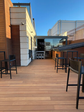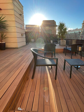 Als het gaat om intensief gebruikte houten oppervlakken buiten, biedt DuroGrit een sterke mechanische bescherming en een ultramoderne uv-bestendigheid. Daarom werd dit garapa houten terras gekleurd en beschermd met DuroGrit in de kleur “Foxy Brown”.