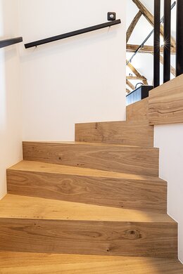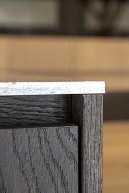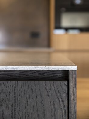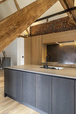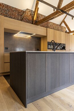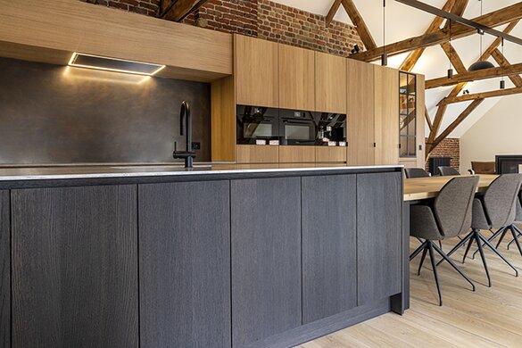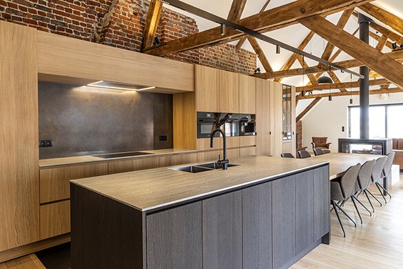 De vloeren en natuurlijke delen van de keuken werden behandeld met Oil Plus 2C in de kleur Smoke 5%. De donkere kasten van het kookeiland zijn behandeld met Precolor Easy (een mix van de kleuren Mystic Brown & Clear) en Oil Plus 2C Black.