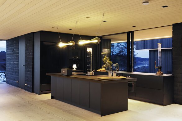 Doorheen het huis wisselen donkere en lichte tinten elkaar af. De sneeuwwitte vloer vormt een groot contrast met de donkere muren. Binnen werd gekozen om de geborstelde vuren muren af te werken met Precolor Easy, kleur Intense Black in combinatie met Oil Plus 2C, kleur Black. Voor het plafond van geborsteld vurenhout en de vloer van douglas vurenhout werd, in tegenstelling tot de muren, gekozen voor een lichtere kleur als afwerking.